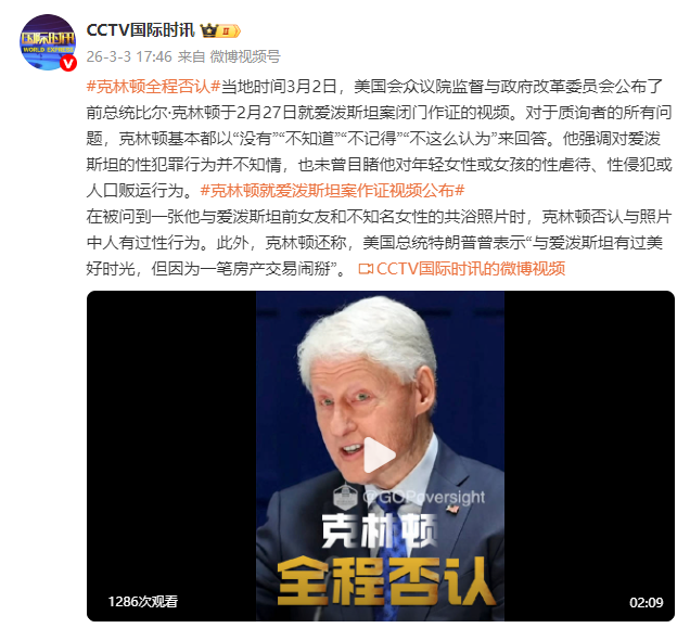 当地时间3月2日,美国会众议院监督与政府改革委员会公布了前总统比尔·克林顿于2月27日就爱泼斯坦案闭门作证的视频。对于质询者的所有问题,克林顿基本都以“没有”“不知道”“不记得”“不这么认为”来回答。他强调对爱泼斯坦的性犯罪行为并不知情,也未曾目睹他对年轻女性或女孩的性虐待、性侵犯或人口贩运行为。